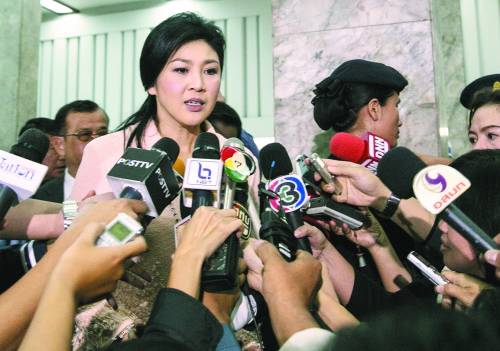 上图:1月21日,泰国看守总理英拉被记者围追。泰国看守内阁21日宣布从22日起在曼谷及其周边地区实施紧急状态法,同时称不会动用武力。CFP供图