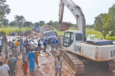 上图:南苏丹瓦乌市至首都朱巴的交通大动脉被大雨冲毁后,近千台车辆被困。中国维和部队紧急出动,经过两昼夜作业,成功疏通受损道路。图为中国维和官兵在帮助陷入泥坑中的车辆。