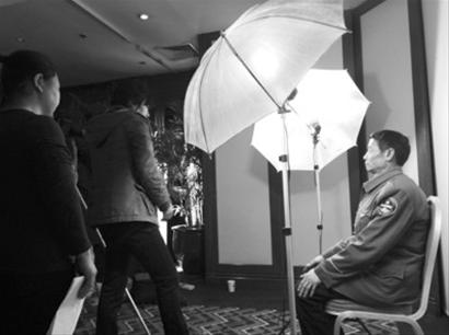 3月10日,马航失联客机乘客家属在北京丽都酒店安置区临时设立的摄影角拍摄签证所需照片。