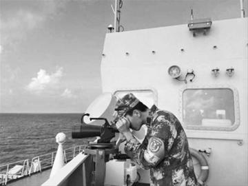 □新华社记者/罗晓光 摄图为3月10日,驶向飞机失联海区途中,井冈山舰值班军人在观察海面情况。 □新华社记者/白瑞雪 摄