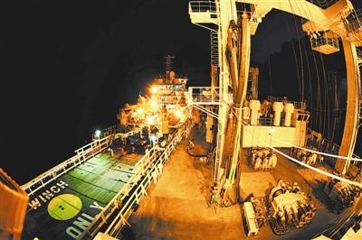 3月18日晚,千岛湖舰对“南海救101”船进行了燃油补给,这是千岛湖舰首次对执行马航失联航班搜救任务的地方船只实施补给。至此,千岛湖舰圆满完成了第一阶段的综合补给任务。随后,千岛湖舰立即高速赶赴苏门答腊岛西南附近水域执行搜索任务。 本报特约记者 代宗锋摄