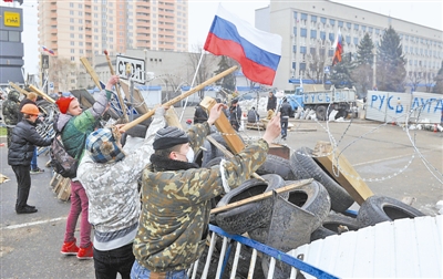 上图:4月10日,在乌克兰东部地区的卢甘斯克市,亲俄民众在安全机构大楼外设立路障。