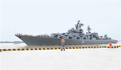 不远处,体格宽大的“瓦良格”号导弹巡洋舰浑身透着“北极熊”的深厚底蕴。随它一同前来的还有“潘捷列耶夫海军上将”号反潜舰、“快速”号导弹驱逐舰和“涅韦利斯基海军上将”号大型登陆舰等。
