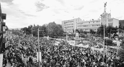 2013年6月,作为应对债务危机的紧缩与改革措施之一,希腊政府宣布关闭国家广播电视公司,此举在希腊激起新一轮抗议浪潮。图为民众聚集在国家广播电视公司大楼前的街道上示威游行,抗议政府的决定。