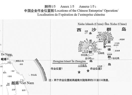 2014年5月2日,中国企业所属“981”钻井平台在中国西沙群岛毗连区内开展钻探活动,旨在勘探油气资源。目前,第一阶段工作已经完成,第二阶段工作已于5月27日开始。前后作业海域距离中国西沙群岛中建岛和西沙群岛领海基线均17海里,距离越南大陆海岸约133至156海里。