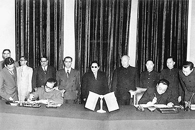 中印两国在就《中印关于中国西藏与印度之间的通商和交通协定》进行谈判期间,周恩来总理首次提出了和平共处五项原则。图为1954年4月协定签署现场。资料图片