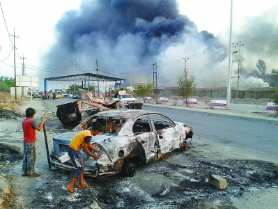 6月10日,在伊拉克北部重镇摩苏尔,孩子们站在一辆被烧毁的车辆旁。