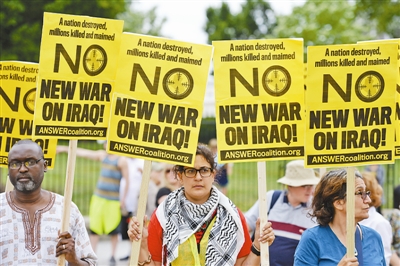 上图:6月21日,在美国首都华盛顿白宫门前,人们举着写有“不要再次对伊拉克开战”的标语牌参加抗议示威。当日,一些美国民众在白宫前示威,反对再次对伊拉克开战。美国总统奥巴马19日宣布采取一系列举措,帮助伊拉克政府打击反政府武装,包括向伊拉克增派300名军事顾问、与伊拉克成立联合行动中心等。 新华社发