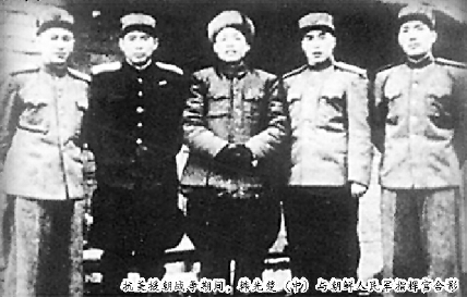 抗美援朝战争期间,韩先楚(中)与朝鲜人民军指挥官合影
