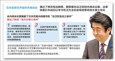 新华社东京7月1日电(记者刘秀玲、冯武勇)7月1日下午,日本政府召开临时内阁会议,通过了修改宪法解释、解禁集体自卫权的内阁决议案,这意味着日本战后以专守防卫为主的安保政策将发生重大变化。