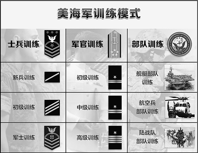 针对士兵训练,美海军采取三步走的训练模式(右图)。第一步,用2个月时间完成新兵训练。美海军每年招募约10万名17至22岁的新兵,在位于加利福尼亚州、伊利诺伊州和佛罗里达州的3个新兵训练中心进行为期8周的单兵基础训练,以基础知识、小艇作业、舰艇管理等为训练课目,淘汰率高达30%,超过陆战队新兵淘汰率12%的两倍。第二步,完成初级训练。海军初级训练周期最长为50周,接近陆战队训练时间的15倍。第三步,完成军士训练。海军军士训练分为初级和高级训练。初级军士训练由预科军士学校和初级军士学校负责实施,训练对象为下士、中士,训练周期因专业不同为6至44周不等。海军高级军士训练由高级军士学校、特种专业技术学校等组织实施。
