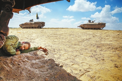 8月4日,在以色列南部与加沙边境的一处阵地,一名以军士兵在装甲车下休息。据以色列Walla新闻网报道,以色列安全内阁4日晚通过了由埃及倡议的72小时无条件停火。新华社发