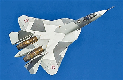 俄罗斯 T-50战斗机,是一款由俄罗斯苏霍伊航空集团主导,在“未来战术空军战斗复合体”计划下开发、生产的高性能多用途战机。由于飞机外壳的70%使用了复合材料,它的隐身性能大大增强。飞机装备最新的雷达系统,能发现400公里以外的目标,同时跟踪60个空中目标并向其中16个发起攻击。T-50的电子战系统和对红外制导弹头的抑制系统能保护其不被防空系统发现。