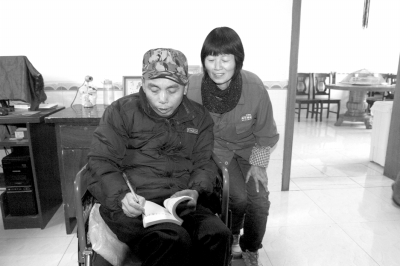 贺晓英的丈夫在记者采访本上留言。贺晓英在一旁看着。光明日报记者 唐湘岳摄