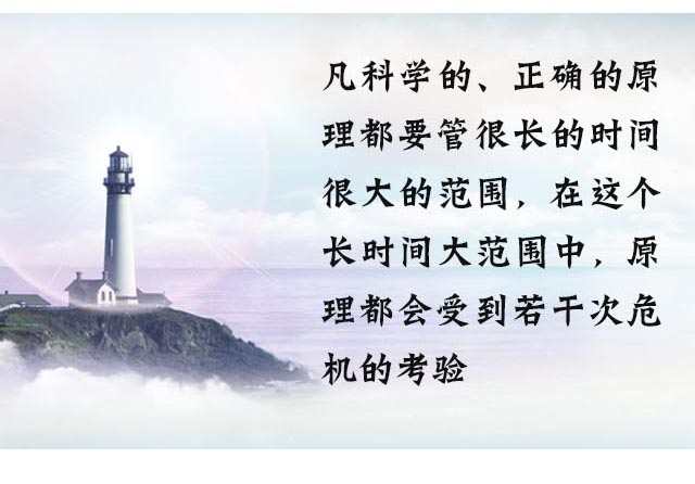 原理就像灯塔照射出的一条航线,而遥远的航行过程却绝不可能和灯光一样笔直明亮。 科学原理讲的是最基本的东西,它突出一个“大”字,要管很长的时间,管很大的范围。它所揭示的是一个很长的过程,它所指导的是一个空前大的实践,因此它要接受空前大的考验,接受前所未有的挑战。这场大实践中所涌现的是空前的曲折跌宕、激动人心、惊心动魄、波澜壮阔的局面。所遇到的挫折和危机自然也就要多些。无论社会科学还是自然科学,在发展过程中许多小的结论被实践轻易否定,并不奇怪,就像风吹枯草一样,人们也不会怎么注意。而这些基本原理,像一棵参天大树,它经受考验在风雨中的挺身舞动会给人极深刻的印象。