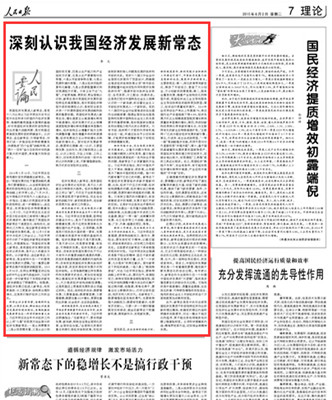 人民网北京6月2日电 (万鹏)我国经济发展进入新常态,是党的十八大以来以习近平同志为总书记的党中央在科学分析国内外经济发展形势、准确把握我国基本国情的基础上,针对我国经济发展的阶段性特征所作出的重大战略判断。今日,人民日报理论版刊发四篇权威学者的解读文章,聚焦经济发展新常态之所以“新”的缘由从何而来,新常态下国民经济如何提质增效,遵循经济运行规律激发市场活力,提高国民经济运行质量和效率。其中,理论版头条《深刻认识我国经济发展新常态》一文,深刻分析了我国经济发展新常态论断的产生,阐述了新常态之所以“新”的缘由,指出了我们正确把握新常态这一概念所应具有的三种认识。