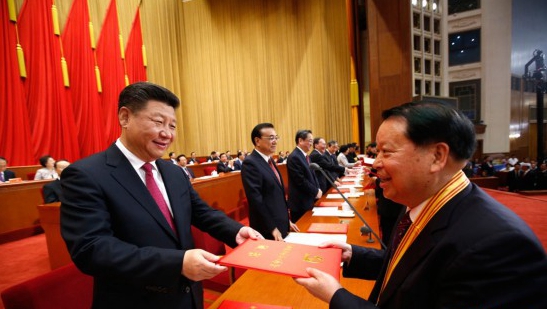 图:7月1日,庆祝中国共产党成立95周年大会在北京人民大会堂隆重举行。这是习近平等在大会上向受表彰的先进个人和先进集体代表颁奖。