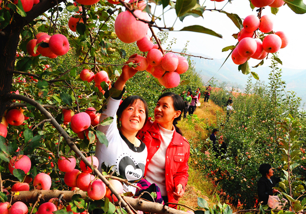 拥有自主知识产权的“沂源红”苹果新品种吸引了八方游客 。(张奎发 摄影)