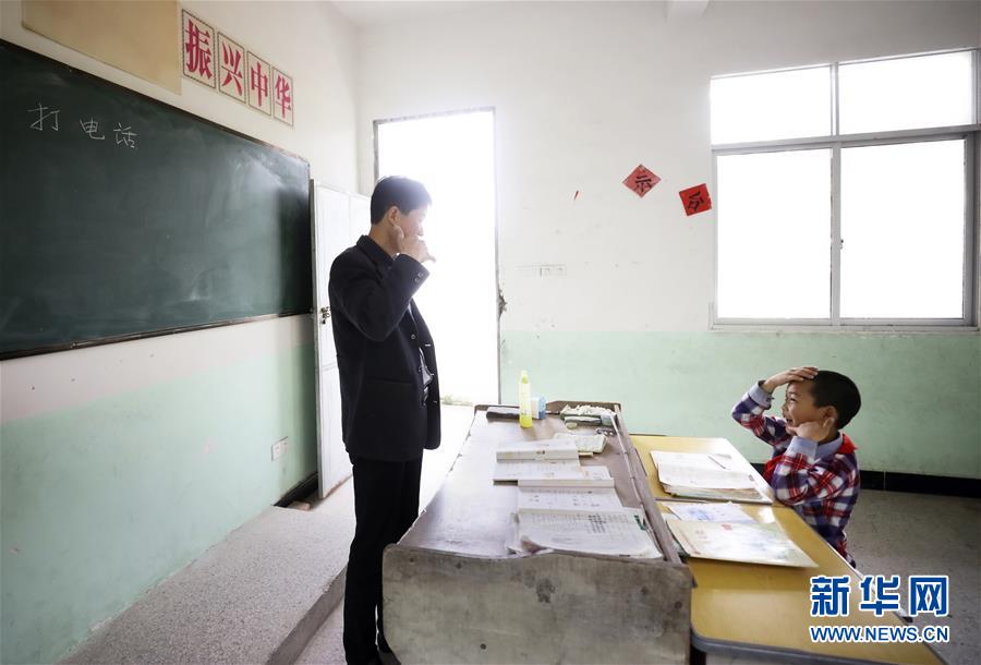 5月8日,王北海(左)在教室内为陈威宇讲解“打电话”的流程。江西省瑞金市大柏地乡三河小学坐落于大山深处。陈威宇是学校里唯一的学生。陈威宇今年9岁,家庭贫困,上学不便。为解决这一难题,当地政府决定恢复陈威宇家附近三河小学的办学工作,今年46岁的王北海被安排为专职教师,从周一至周五,王北海几乎每天24小时陪伴在陈威宇身旁,既当老师也当“家长”,照料他的学习和生活。新华社记者兰红光摄