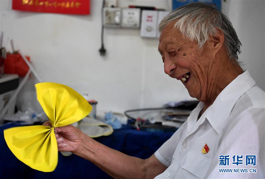 7月31日,叶连平在“留守未成年人之家”教室里欣赏学生刚刚送给自己的折纸礼物。92岁的退休教师叶连平生活在安徽省和县乌江镇卜陈村,村里的年轻人大多外出工作,留下的多是老人和孩子,家长普遍没有能力辅导孩子学习。2000年,原本是老师的叶连平决定创办“留守未成年人之家”,为孩子们免费补习英语。19年来,叶连平帮助过的孩子超过1000名。新华社记者刘军喜摄