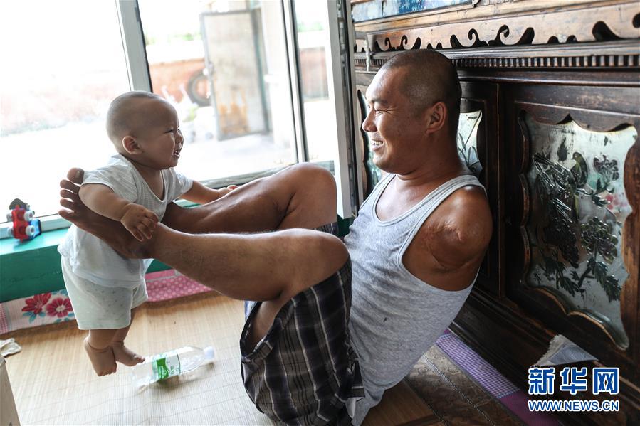 8月8日,王刚与儿子“肉肉”在家中玩耍。33岁的王刚来自辽宁省铁岭市昌图县两家子镇河西村。作为父亲,王刚虽然没有坚实的臂膀去拥抱自己的孩子,但他一直努力用自己的方式呵护照顾家人。“无臂爸爸”的父爱给很多人带来了力量和鼓舞,被人亲切地称为“最强爸爸”。新华社记者潘昱龙摄