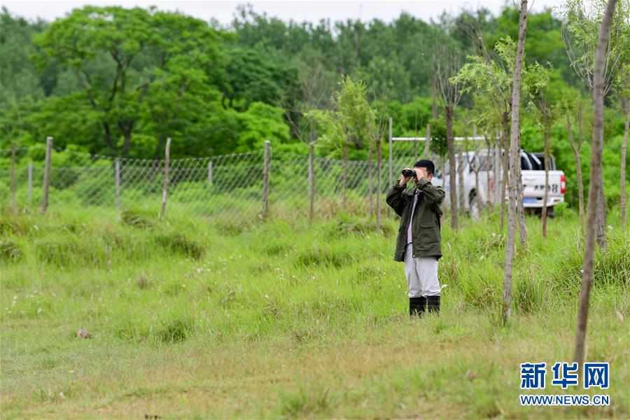 6月11日,任义军在江苏大丰麋鹿国家级自然保护区内观看麋鹿种群活动情况。新华社记者 李博 摄