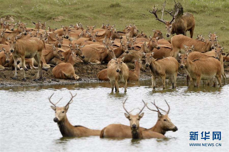 6月11日,在江苏大丰麋鹿国家级自然保护区,麋鹿在水塘附近休憩。 新华社记者 韩瑜庆 摄