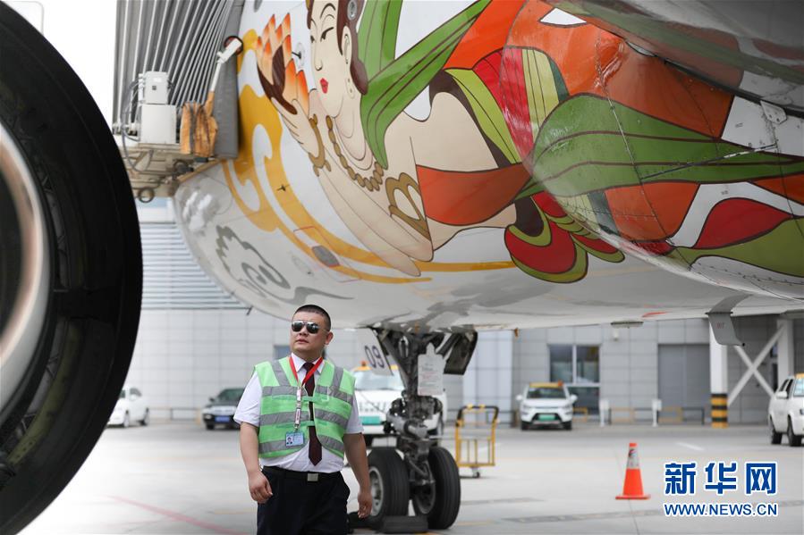 6月12日,在兰州中川国际机场停机坪上,曾桐堂在做航前绕机检查。
