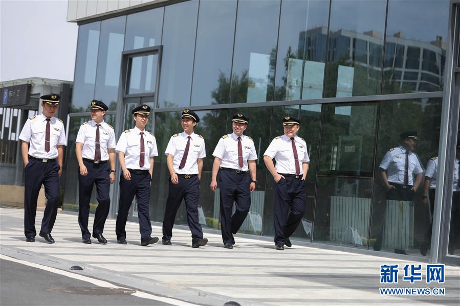6月12日,在中国东方航空股份有限公司甘肃分公司,曾桐堂(右一)、张鹏(左三)和其他机长们一起出发去做航前准备工作。 新华社发(马希平 摄)