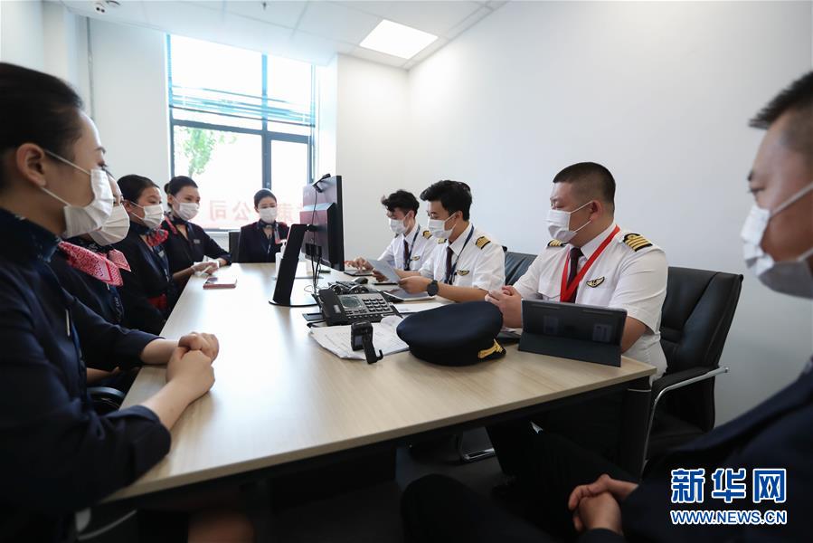 6月12日,在中国东方航空股份有限公司甘肃分公司,张鹏(右三)和曾桐堂(右二)在飞行前进行机组联合准备。新华社发(马希平 摄)