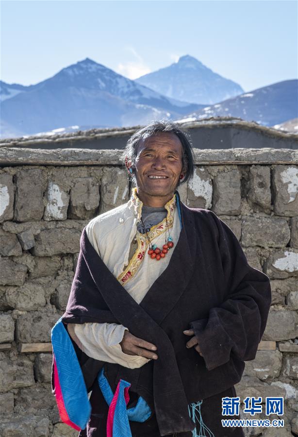 这是格桑站在自家院子里,远处的背景是世界最高峰珠穆朗玛峰(1月22日摄)。新华社记者孙非摄