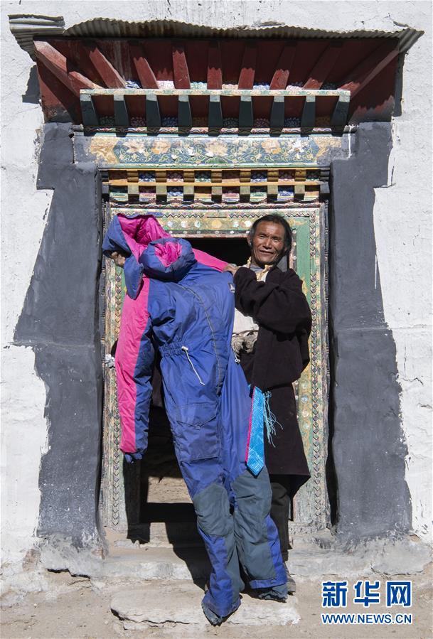 这是格桑在展示自己登顶时穿过的连体羽绒服(1月22日摄)。新华社记者孙非摄