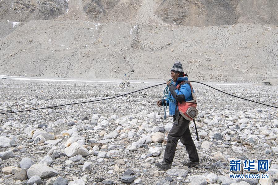 这是格桑和其他村民一起正在将光纤运送至前进营地的路上(4月15日摄)。2020珠峰高程测量期间,为保障峰顶信号质量,网络运营商需要将光纤铺设至海拔6500米的珠峰前进营地。格桑和其他村民一起,承担起运输光纤的任务。新华社记者孙非摄