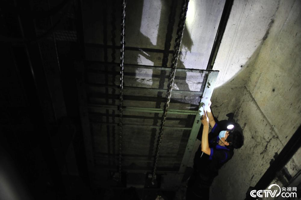 王伟架起照明灯开始仔细检查各个零部件,郑张永则用毛巾擦拭器械上的灰尘:“清洁这一步非常重要,要是井道内灰尘渣滓多,电梯故障率就会升高。”