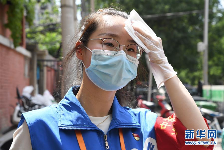 6月16日,在北京市海淀区中关村街道白塔庵社区出入口,疫情防控志愿者王玥在擦拭汗水。 连日来,北京出现高温天气。酷暑中,工作人员坚守抗击疫情一线,成为烈日下的“逆行者”。 新华社记者 任超 摄