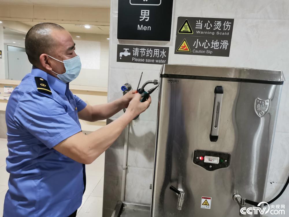 胡清明将候车室公共热水桶松动的螺丝拧紧。