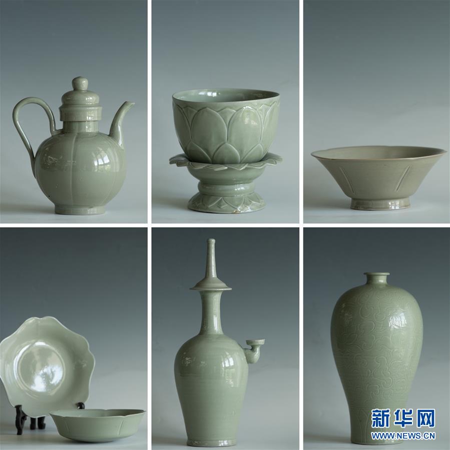 闻氏父子烧制的秘色瓷器皿(拼版照片,6月17日摄)。新华社记者 翁忻旸 摄