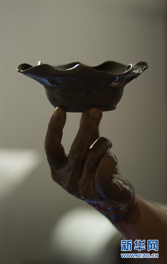 6月17日,在位于浙江慈溪的工作室,闻长庆将一件盏托浸入用本地草木灰调制的釉料中。新华社记者 翁忻旸 摄