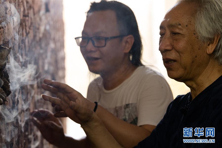 6月17日,在位于浙江慈溪的工作室,闻长庆和儿子闻果立检查新窑的窑壁。新华社记者 翁忻旸 摄