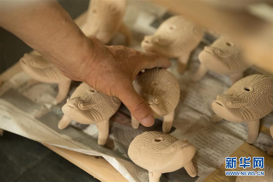 6月17日,在位于浙江慈溪的工作室,闻长庆查看一件素烧后的蟾蜍砚滴。新华社记者 翁忻旸 摄