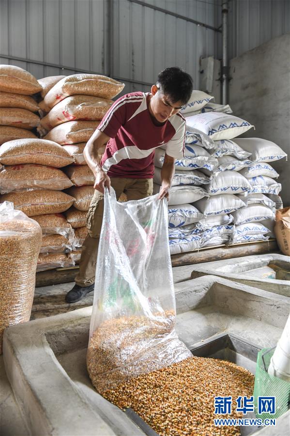 6月18日,覃永灵将饲料玉米投入拌料池中。