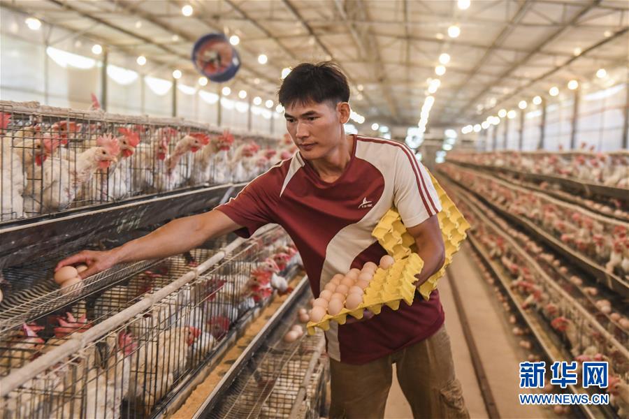 6月18日,覃永灵在养殖场内捡拾鸡蛋。新华社记者 曹祎铭 摄