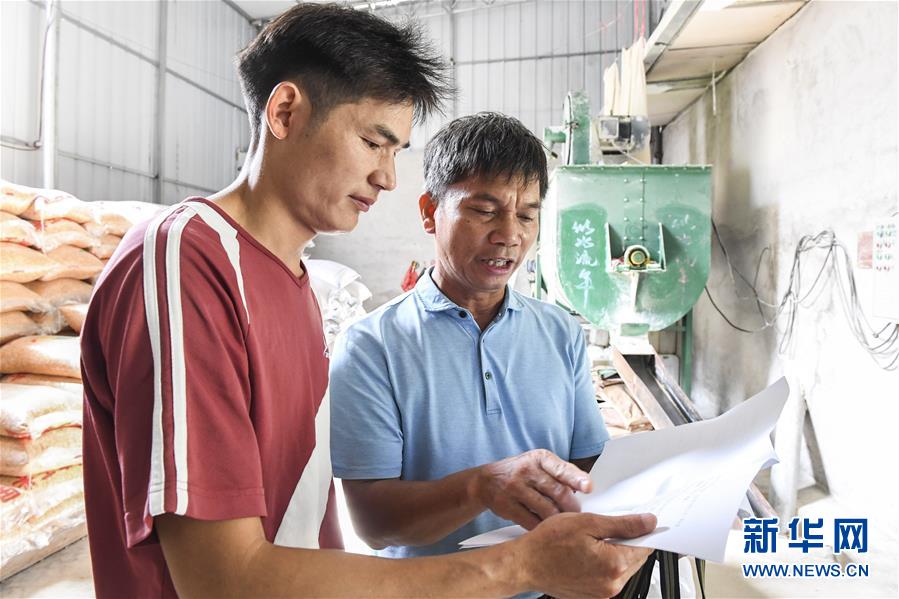 6月18日,武宣县金鸡乡扶贫干部(右)给覃永灵讲解建设“扶贫车间”的有关政策。新华社记者 曹祎铭 摄