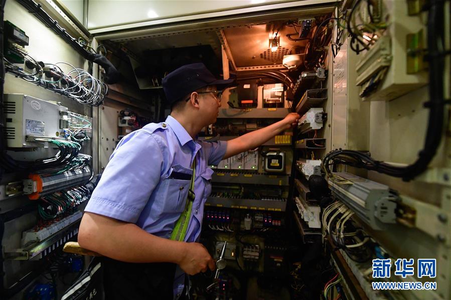 6月20日,李海峰在西宁车辆段乘务车间检查列车配电箱。 新华社记者 张龙 摄
