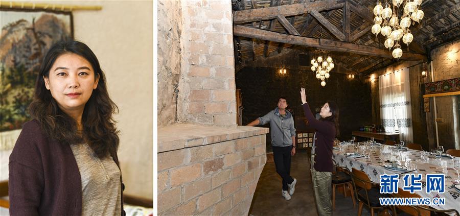 拼版照片:左图是在新疆塔什库尔干塔吉克自治县县城的特色民宿酒店拍摄的查娟(6月4日摄);右图为查娟(右)和当地创业青年迪力达尔·牙合甫在讨论一家特色餐厅风格设计(6月4日摄)。新华社记者 胡虎虎 摄