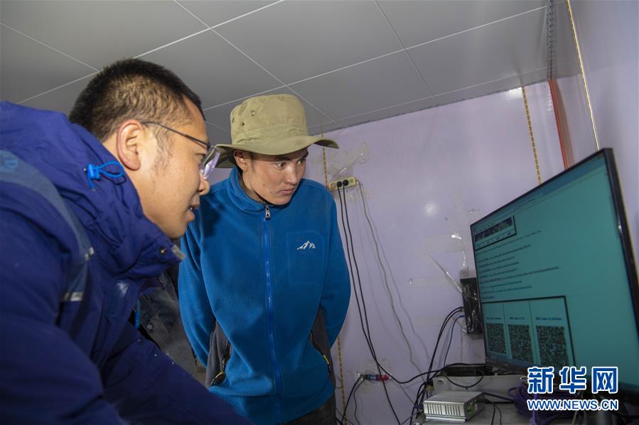 在中国科学院新疆天文台慕士塔格观测站,冯国杰(左)为助理观测员阿克力·图拉提讲解当晚观测要点(6月15日摄)。新华社记者 胡虎虎 摄