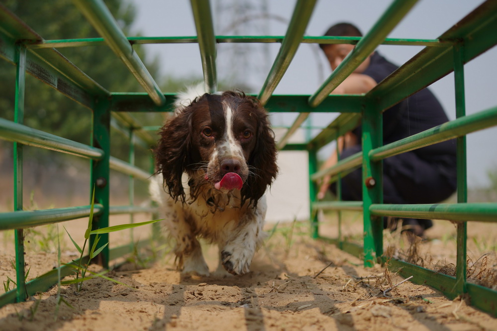 6月26日,河北省邢台市公安局警犬基地训导员周伟带着棕白相间的史宾格犬“播求”进行毒品搜查训练。突然,“播求”安静地坐到地上,抬头看了看周伟,而后两眼盯着三号搜救箱,周伟打开搜救箱发现里面有一个放有毒品的盒子。不到1分钟,精心藏匿的毒品就被“播求”从7个搜救箱里搜寻出来。