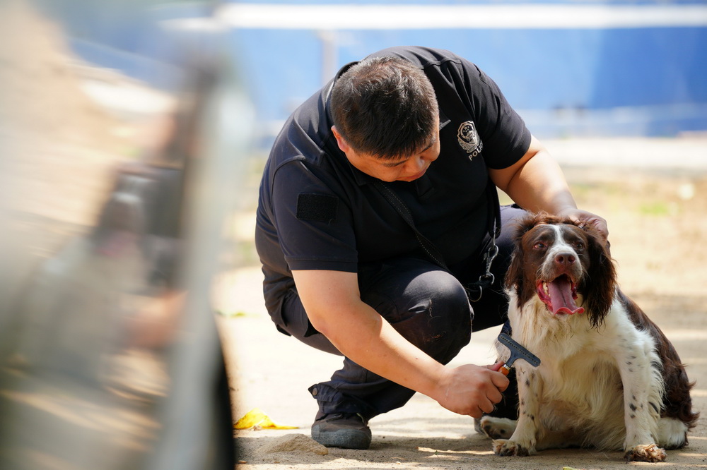 6月26日,河北省邢台市公安局警犬基地训导员周伟带着棕白相间的史宾格犬“播求”进行毒品搜查训练。突然,“播求”安静地坐到地上,抬头看了看周伟,而后两眼盯着三号搜救箱,周伟打开搜救箱发现里面有一个放有毒品的盒子。不到1分钟,精心藏匿的毒品就被“播求”从7个搜救箱里搜寻出来。