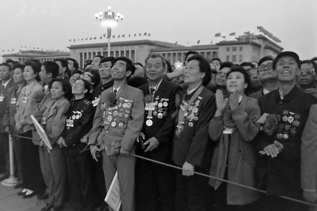 ▲1995年5月1日,申纪兰(前排右三)在天安门广场看升旗。许之丰 摄