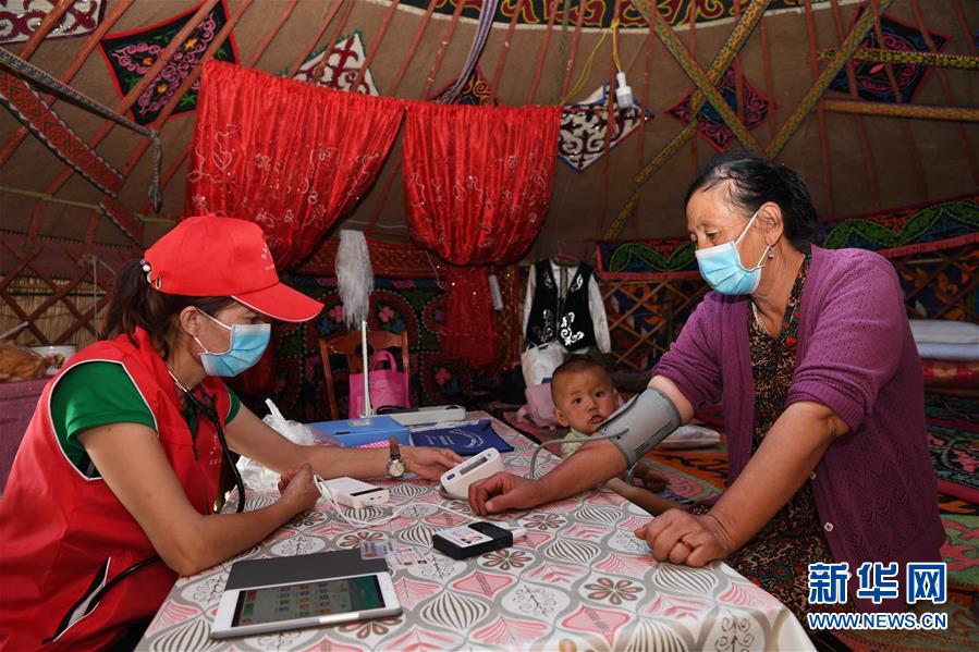 6月20日,新疆布尔津县也格孜托别乡医生布勒布勒古丽·金恩斯汗(左)给牧民检查身体。新华社记者 沙达提 摄